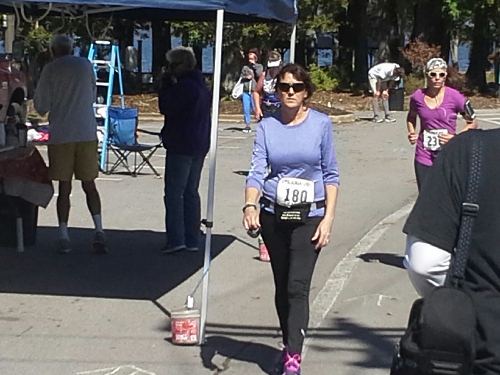 Our hotel was a mile from the race tents. We slept an hour later than Saturday and made it to the start around 6:30 AM. The marathon started at 7:00 AM and the half at 7:30 AM, so I was able to watch as Ron crossed the start line.
