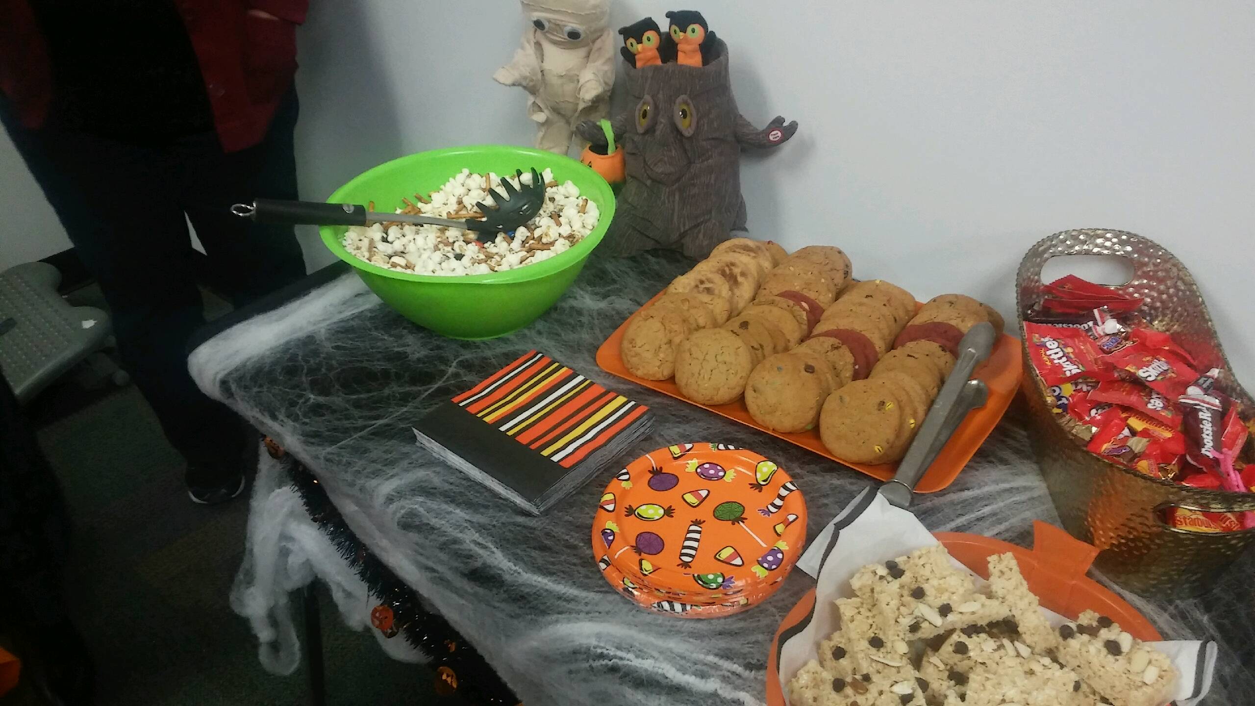 Settling on wormy orange punch, witches brew and blood (orange) punch, I purchased cauldrons, ladles, spider webs and more. On Thursday night, I worked late but still managed to pick up fresh vegetables, fruit and a few other last minute supplies. I made sure we had enough to feed an army even though I only needed enough for 15 people. I enlisted help from family, picking up the cookies, baking treats, making dip and putting up with my insanity.